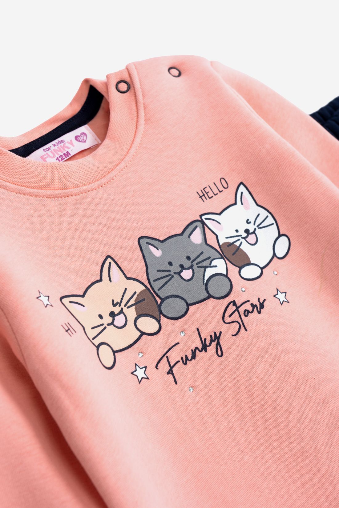 Este conjunto de 2 piezas para bebé niña combina comodidad y estilo con un delicado diseño de gatitos. Perfecto para los primeros meses, sus tejidos suaves mantienen la piel sensible protegida mientras ofrecen libertad de movimiento. Ideal para crear un look tierno y sofisticado en cualquier ocasión.
